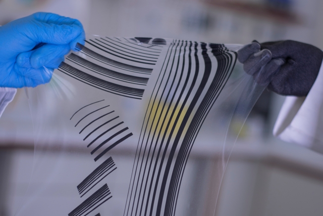 Am Center Smart Materials and Adaptive Systems entwickelte, elektrisch leitfähige Silikone lassen sich über eine Rollensiebdruckeinheit in nahezu jeder Geometrie auf eine Trägerschicht aus Silikon aufdrucken, wodurch die Ausgestaltung als nicht nur flexible, sondern auch elastische und dehnbare Leiterbahn möglich ist.